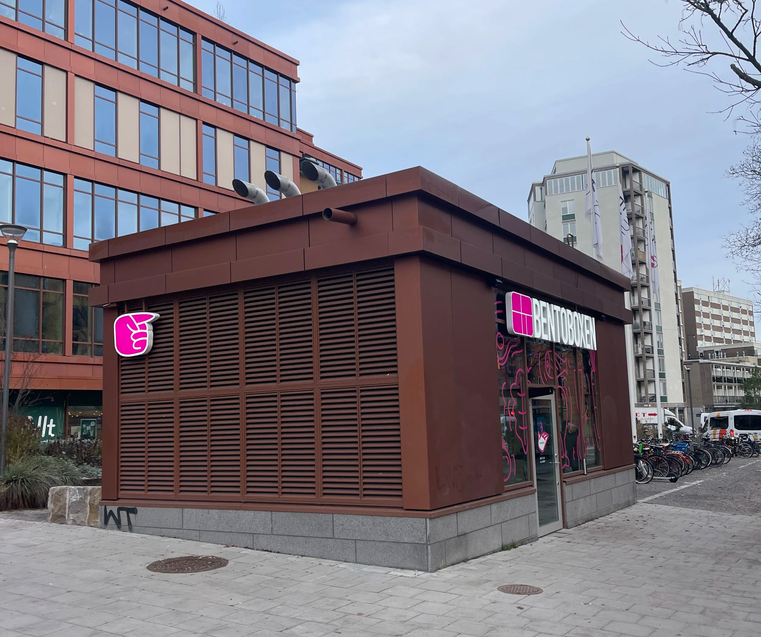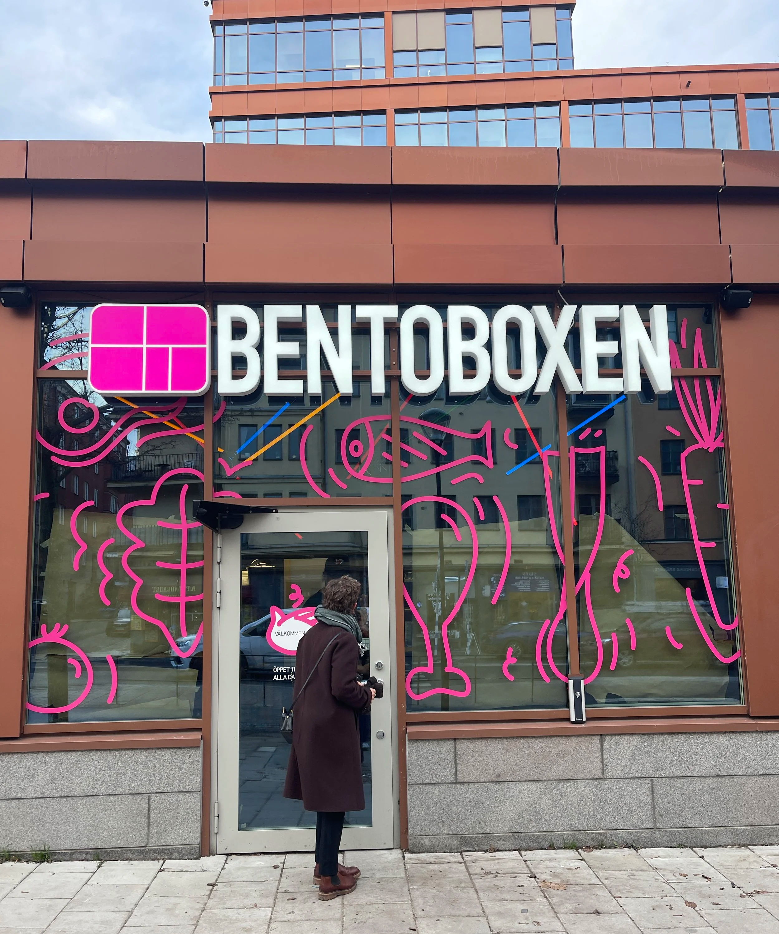Bento Food Factorys första kontakt med slutkonsument. De blev med kiosk på Folkungagatan 125 på Södermalm i Stockholm. Vi smyckade byggnaden med matiga illustrationer och handfasta skyltar som pekar gästerna i rätt riktning.